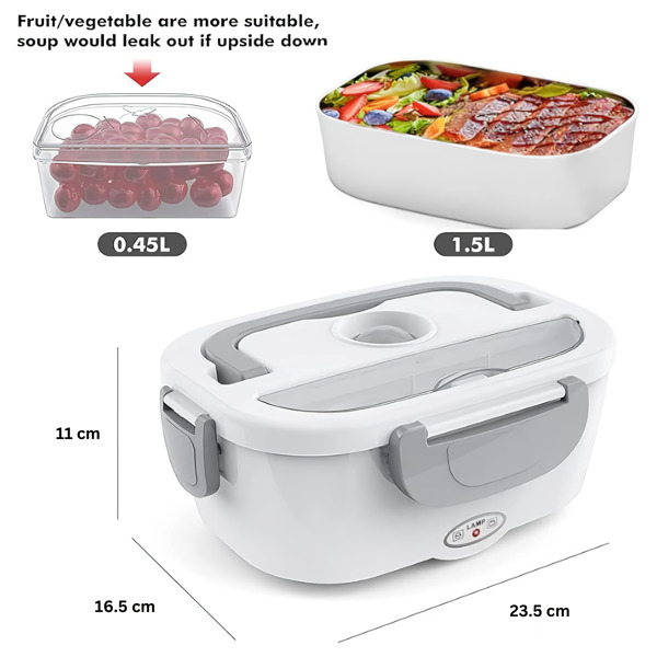 Os 2 compartimentos removíveis de PP mantêm o seu prato principal e acompanhamento separados – e ambos vão direto para a máquina de lavar louça depois. Funciona no escritório, no carro, num estaleiro de obras ou em qualquer divisão com uma tomada elétrica.