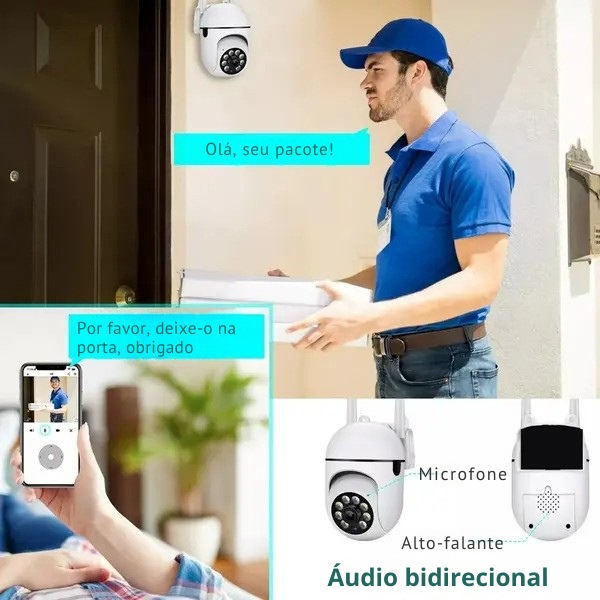 Com o microfone responsivo integrado na câmara de segurança exterior, pode ouvir e falar através da nossa aplicação. O áudio bidirecional permite-lhe comunicar com os seus convidados, enquanto que o alarme de deteção de movimentos o ajuda a livrar-se rapidamente de visitantes ou animais indesejados.